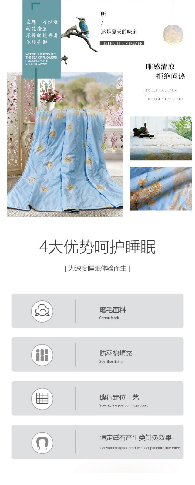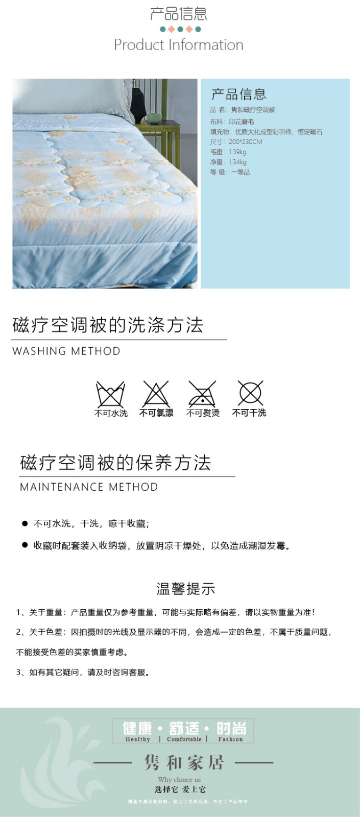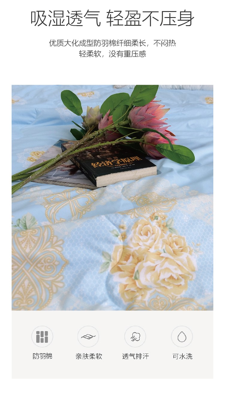 描述:磨毛面料亲肤柔软细腻,降低与肌肤的摩擦,贴近肌肤更温柔,优质大化成型防羽棉纤细柔长,不闷热轻柔软,没有重压感 ,采用科学的磁粒排布,产生立体磁场让全身沐浴在磁场中,补充身体能量。优质染料印染印花图案精致灵动水洗不易褪色,色彩清新耐看
