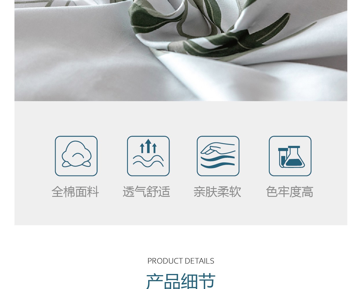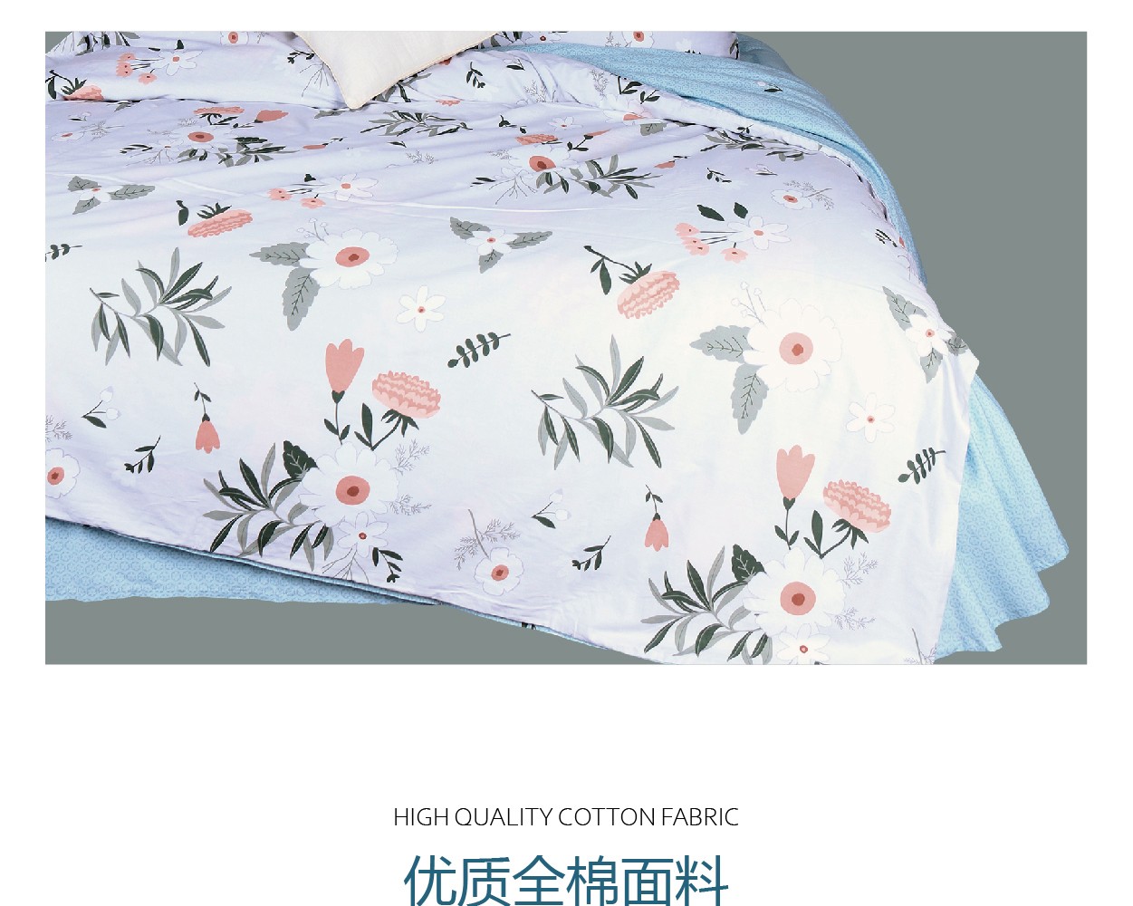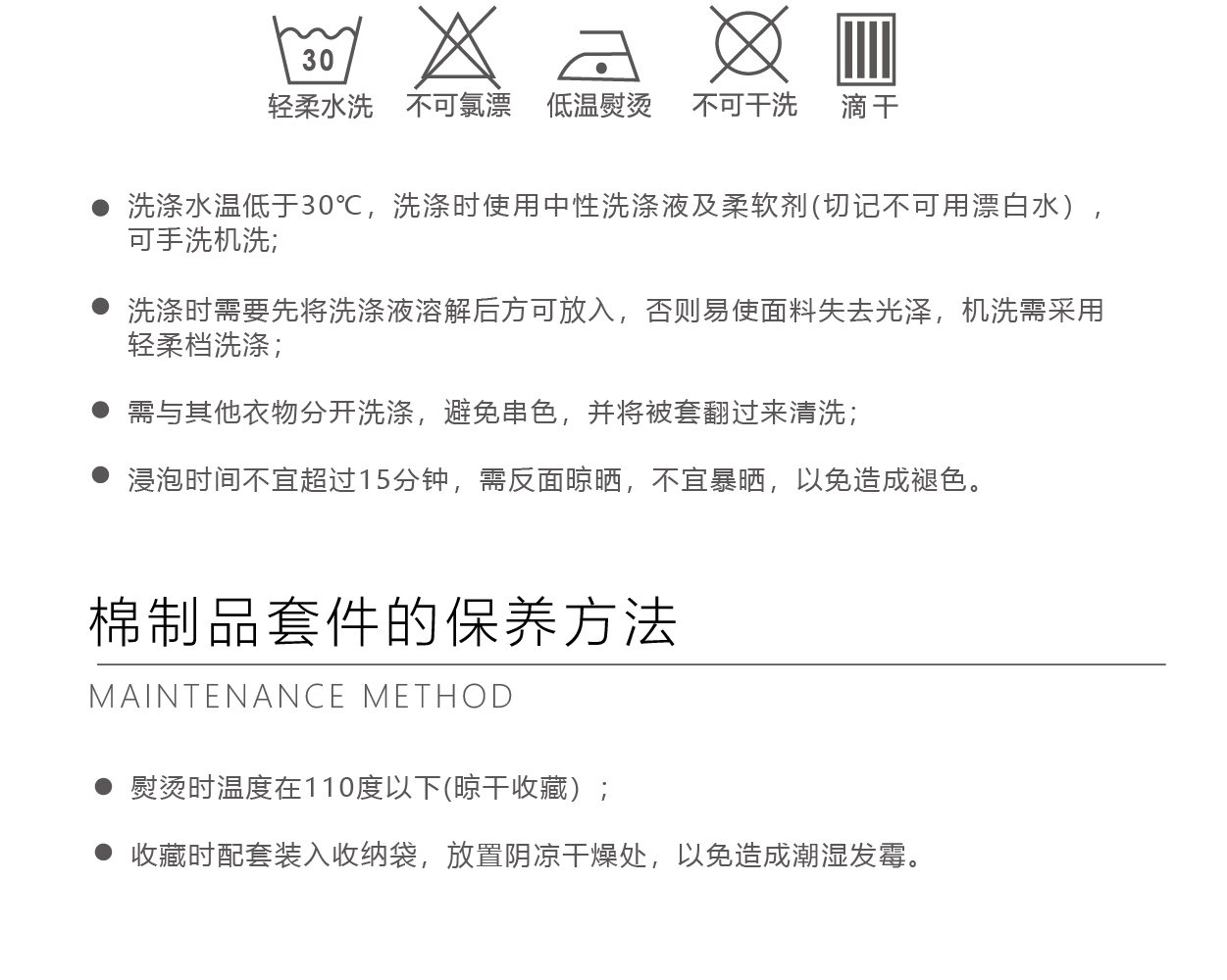 描述:全棉面料,吸湿透气,滑爽亲肤,带给您舒适的睡眠体验 织造面料的每一根纤维 选取长度均大于30mm,精梳去除粗纤维,无任何断线起球。