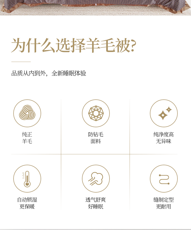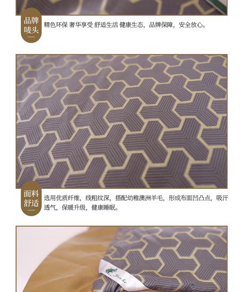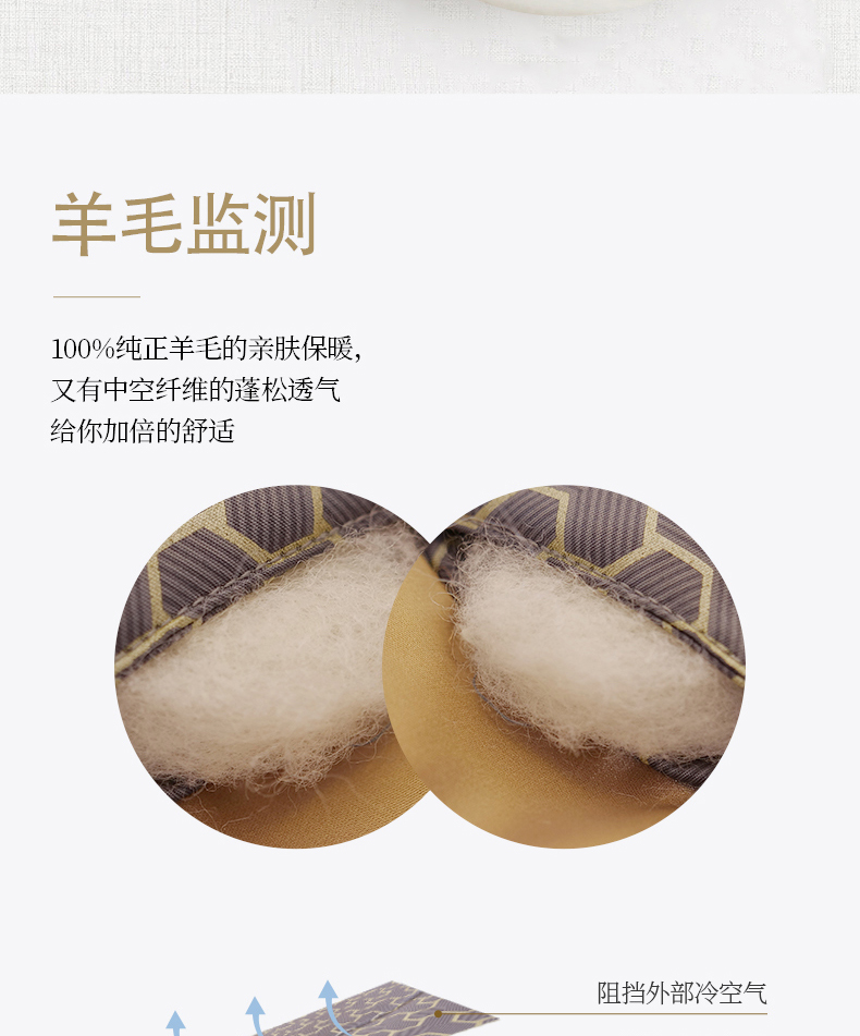描述:挑选高品质羊毛填充,卷曲特性能够存储大量空气,提温不易流散更保暖 层层甄选,经过碳化处理工艺脱去油脂与杂质,杂质少清洁度高,安全无异味