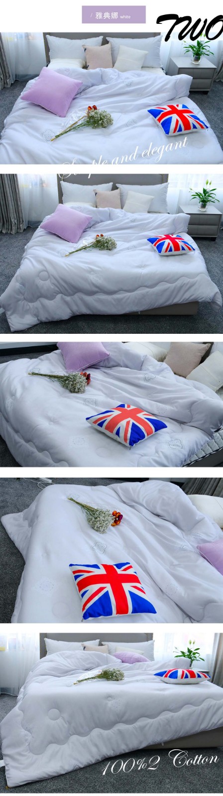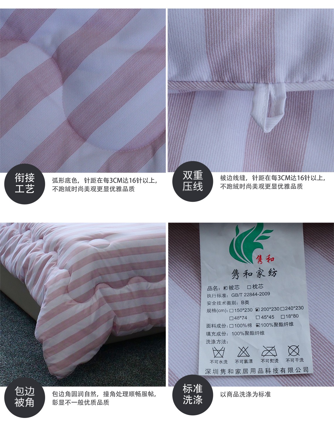描述:高品质绗缝设备绗缝花型精致包边工艺,成型棉结构,不会造成被芯里的棉揉团打結,舒适柔滑保暖。