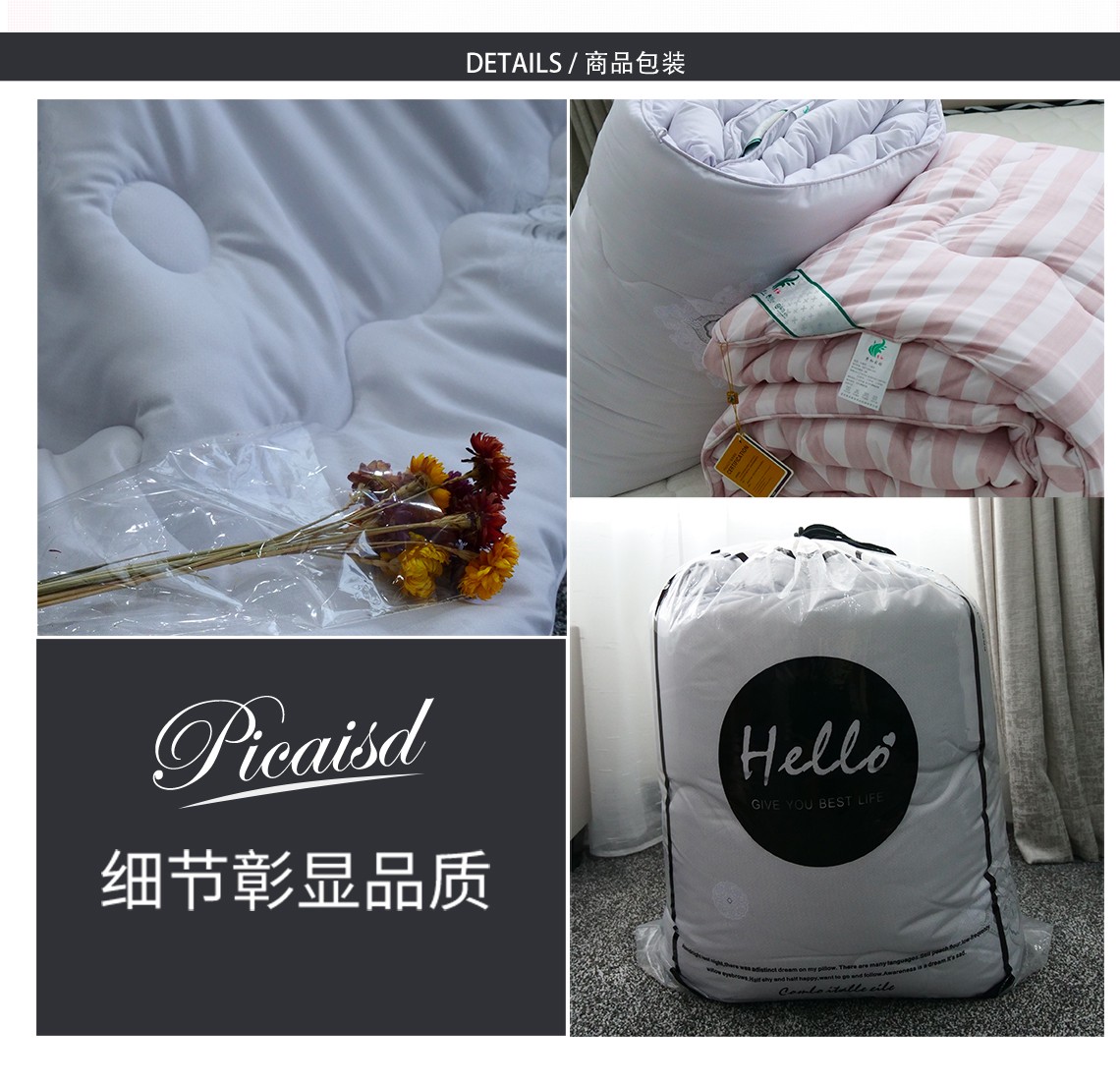明细:被芯*1   高档透明穿绳PE伸缩袋包装*1
