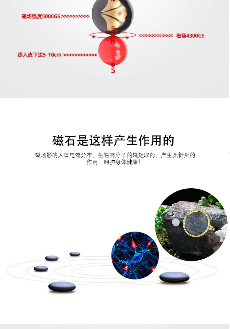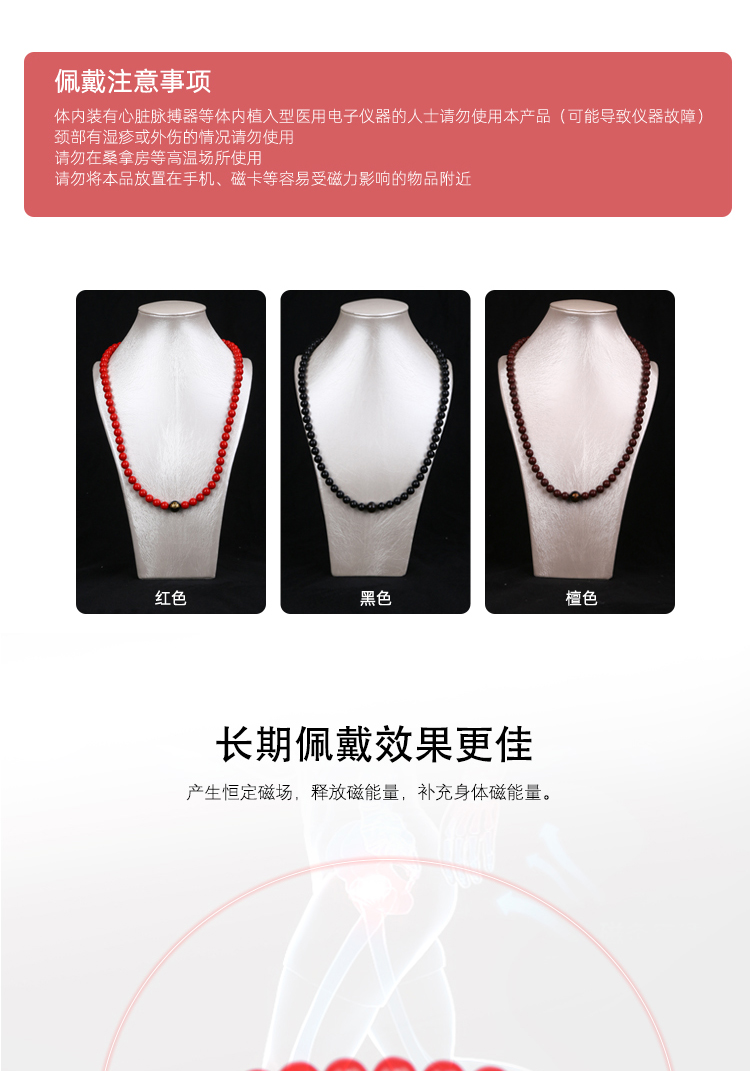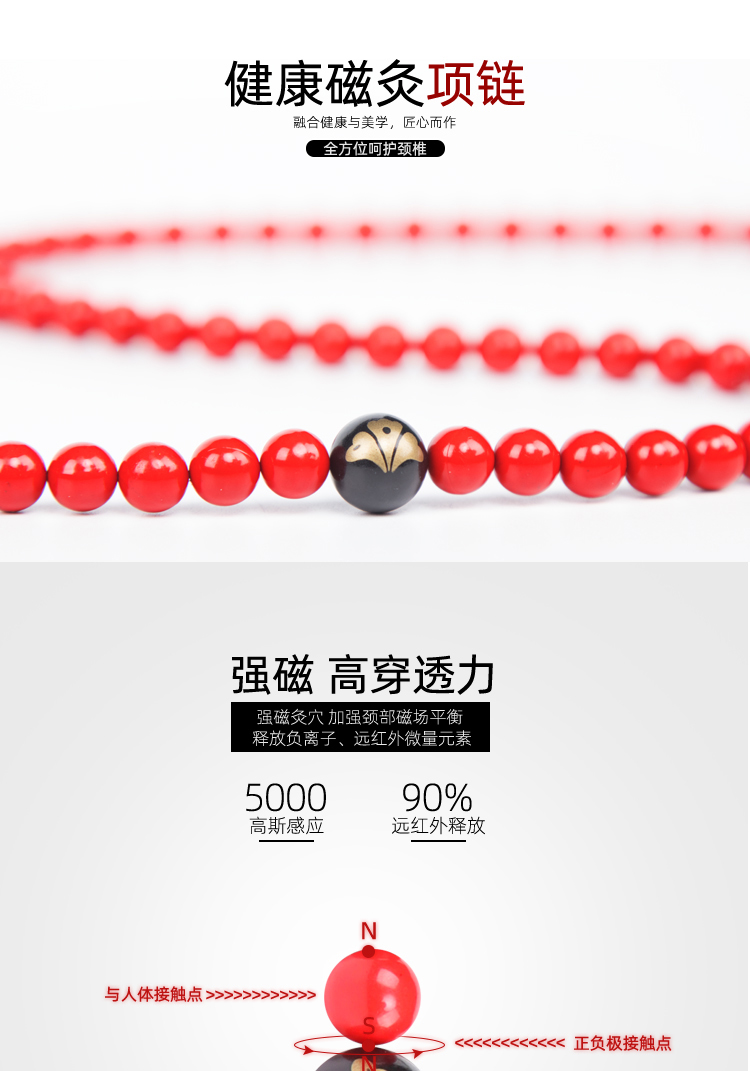 描述:108颗高穿透磁石,24小时释放磁能量,刺进颈部穴位,呵护颈部健康,且无绳设计,可任意调整长度作为手链脚链使用。