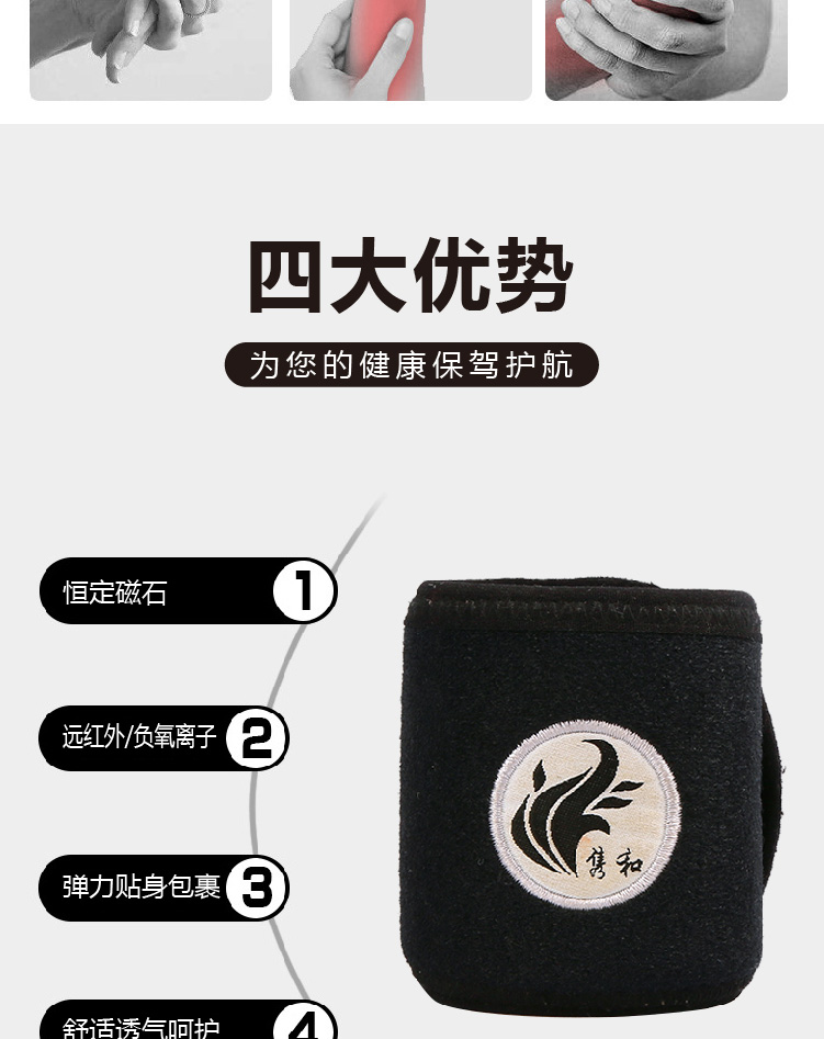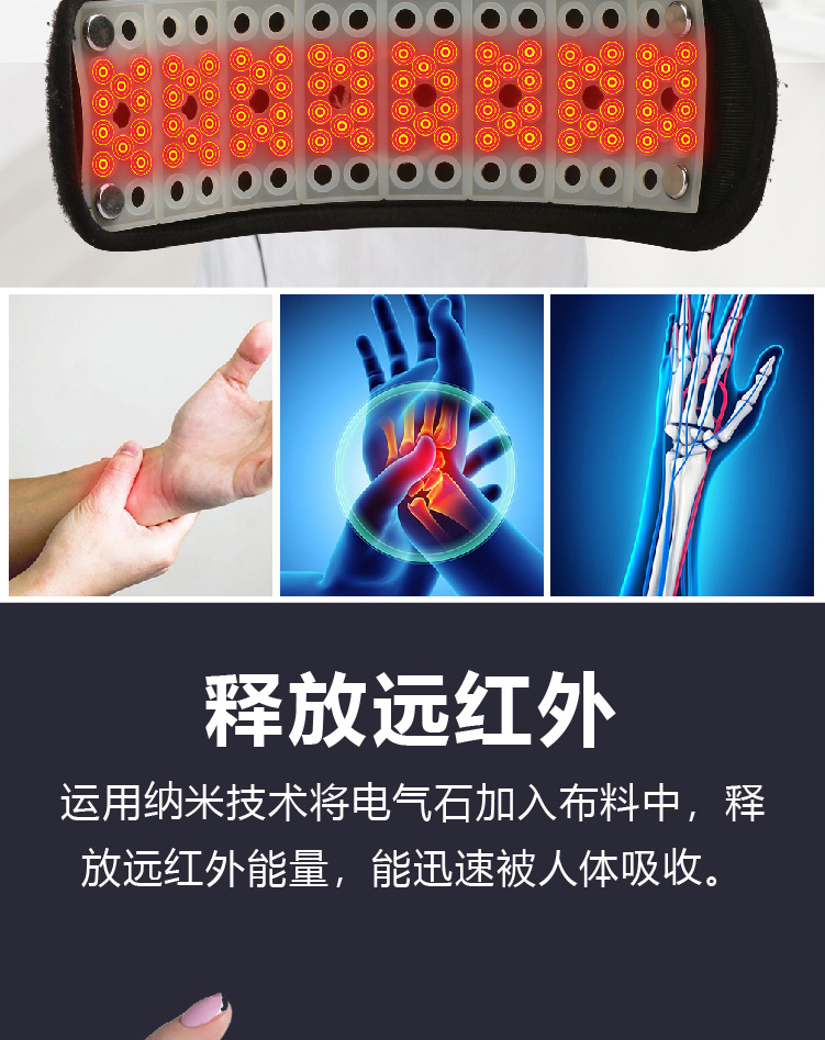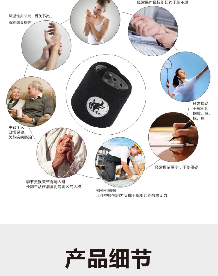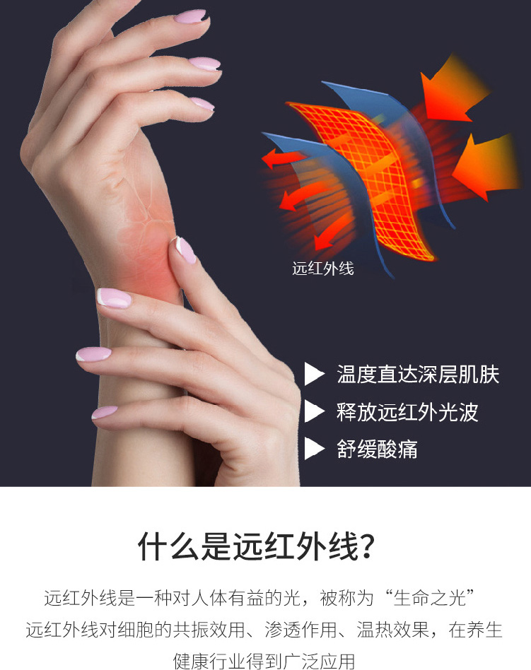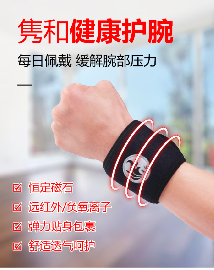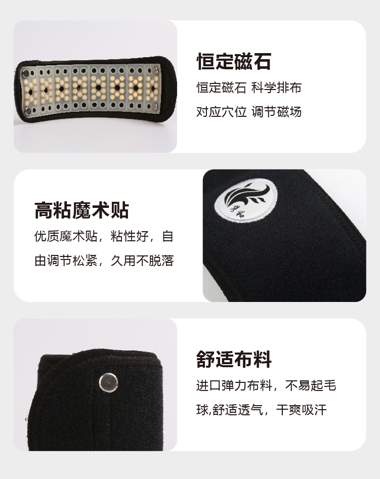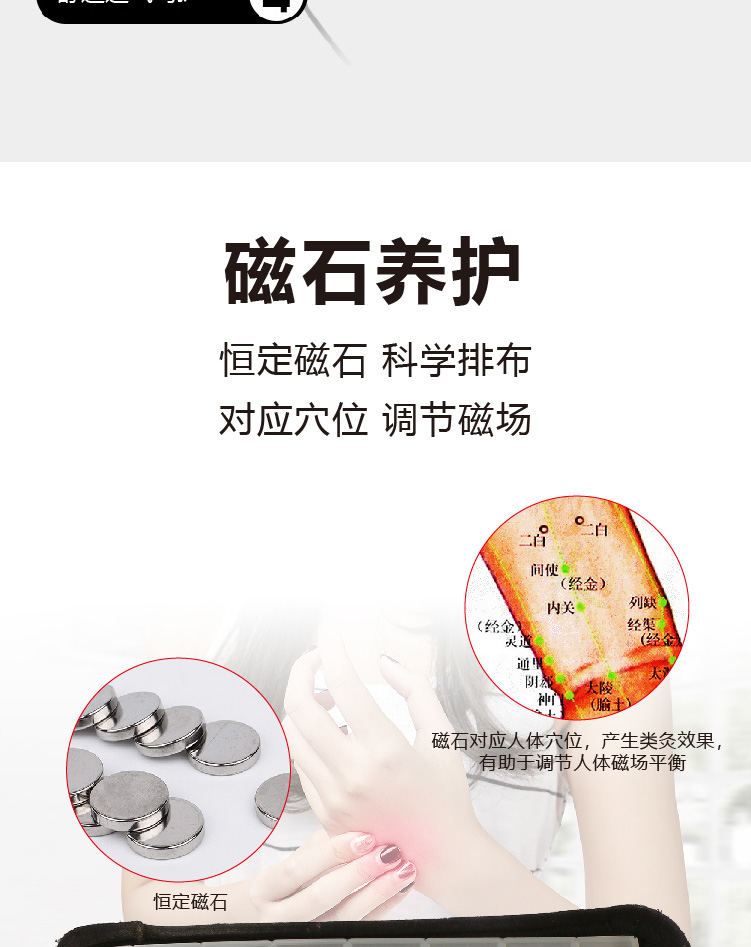 描述:内嵌生物磁石,磁场作用于局部穴位,产生类针灸效果,还可用于缓解手腕部关节炎,肿胀,麻木等不适。