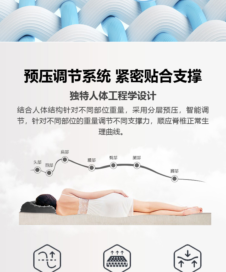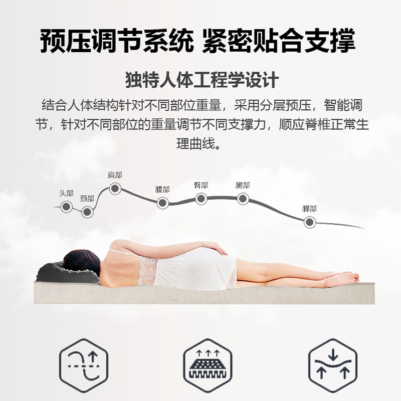 描述:14层功能结构层,蕴含托玛琳、负离子、远红外、磁石养生、按摩等功能 采用人体生理曲线设计,能调节不同部位体重的支撑力,零压力更舒适 打造出科学的健康睡眠系统,在睡眠中起到养生的作用