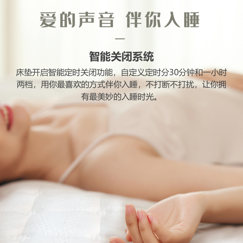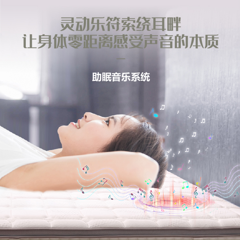 描述:床垫采用天然乳胶、高仿真全景声音响、高密度回弹棉等15层复合材料结构、内置音乐睡眠系统、灵动乐符索饶耳畔让身体零距离感受音律带来的震动按摩体验,立体环绕一键蓝牙连接、零压乳胶完美贴合身体曲线、让你尽情享受好睡眠。