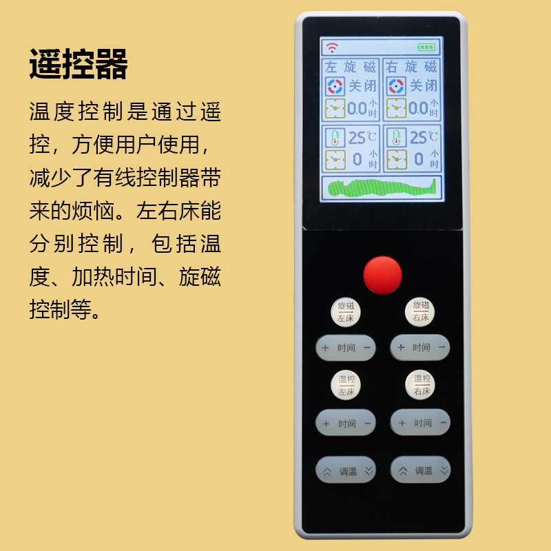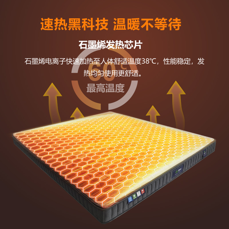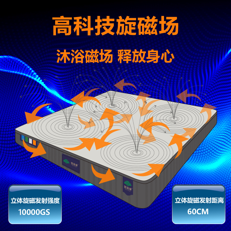 描述:床垫采用旋磁发射器、恒定能量磁场层、石墨烯发热层、负离子释放层、高密度棉等多层复合材料结构,床垫左右分区,可自由在旋磁和静磁方面调节。石墨烯电离子快速加热至人体舒适温度38°;C。温软好床垫、不仅睡得舒适,还能发射磁及远红外负离子、让你在睡眠中被动养生,尽情享受好睡眠。