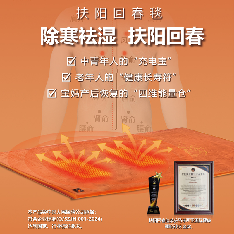 描述:楚逸康扶阳回春毯是一款具备石墨烯发热及磁石理疗等多重功能为一体的功能垫子,对于女性月子、痛经,瑜伽保健等有很好的帮助作用,同时此产品在2025年马来西亚获得国际健康睡眠科技金奖。